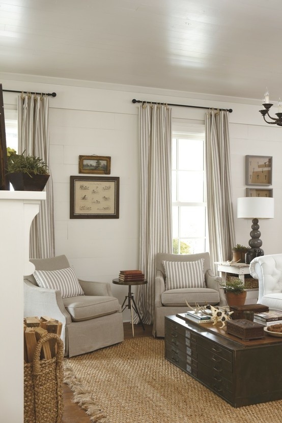 比如這張圖里地毯與茶幾顏色過于“大面積”所以都不適合作為窗簾顏色的參照色,但如果是和灰白條紋的沙發抱枕保持一致就毫不違和。而且也符合上文提到的比墻面顏色要深一點的準則。