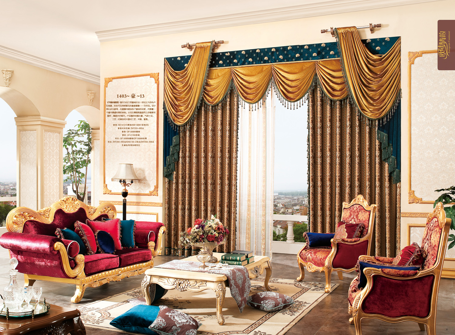 花型、色彩及款式:融合各種歐式花卉及卷草圖案。以金色調為主,酒紅、紫紅等為配色,搭配層次豐富的水波簾頭款式及歐式花邊進行設計。(如:吊珠類花邊等)