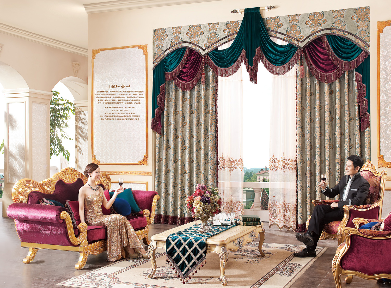 花型、色彩及款式:融合各種歐式花卉及卷草圖案。以金色調為主,酒紅、紫紅等為配色,搭配層次豐富的水波簾頭款式及歐式花邊進行設計。(如:吊珠類花邊等)