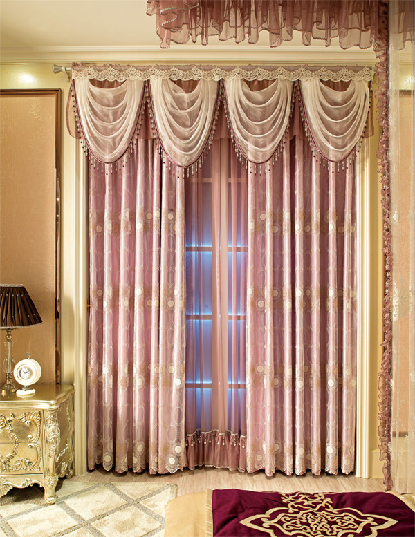 花型、色彩及款式:花型以抽象的花卉圖案為主;色彩濃郁,以深色調(diào)為主。如:紫色、玫紅。平過(guò)簾頭或波浪簾頭款式均可使用。