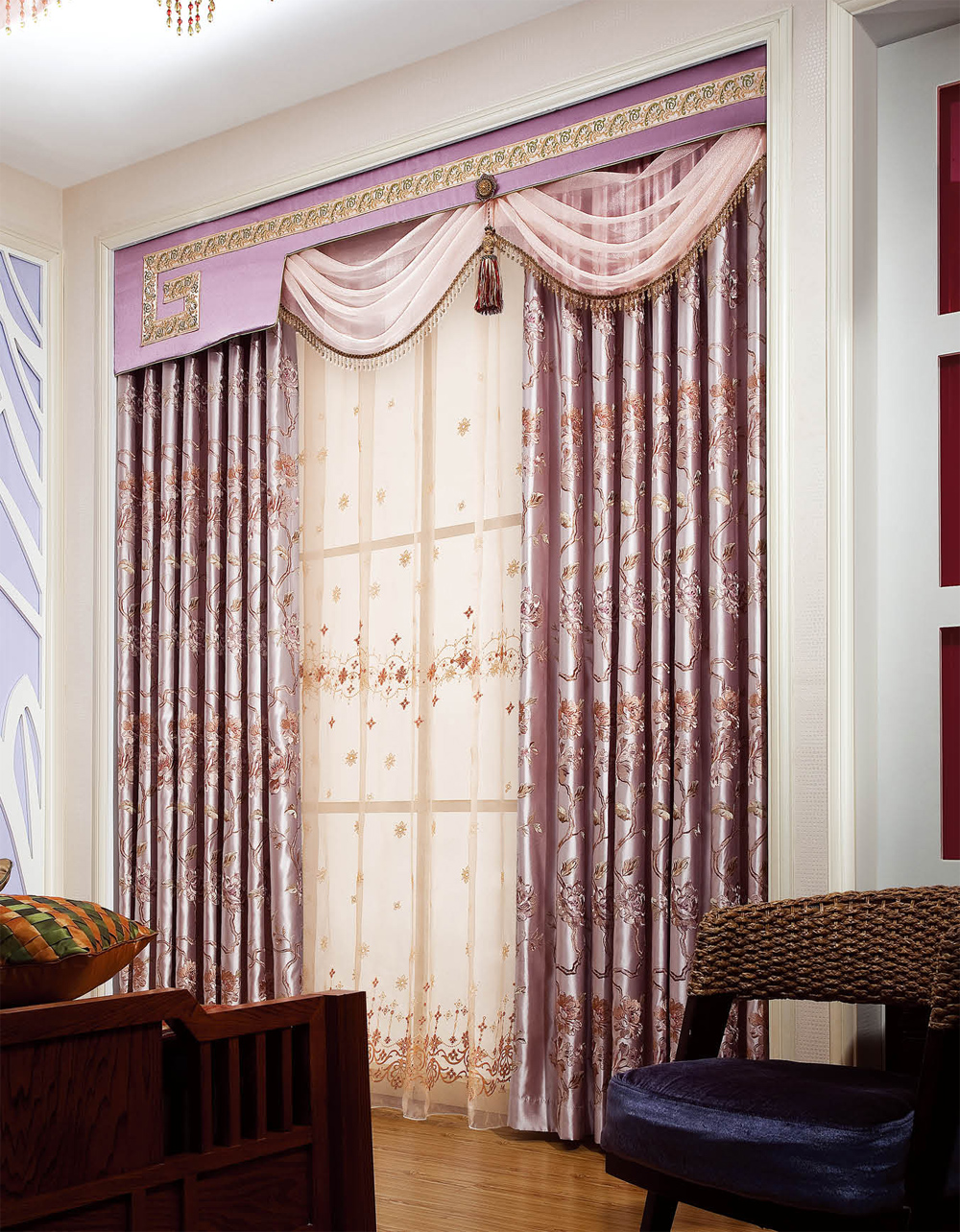 花型、色彩及款式:花型上采用中國傳統的圖案(如:和氏壁、祥云、圍棋等),體現中國美學;以棕色調、米色調為主,款式可采用直線造型的平過簾頭、水波簾頭或二者相結合的形式。